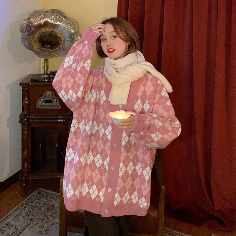 カラージャケット オータムウィンタースタイルVネックニットカーディガンセーター ピンク 秋物 冬物 スーパーモール95666728871