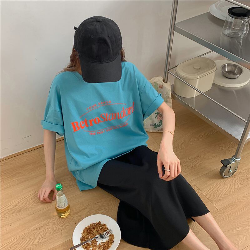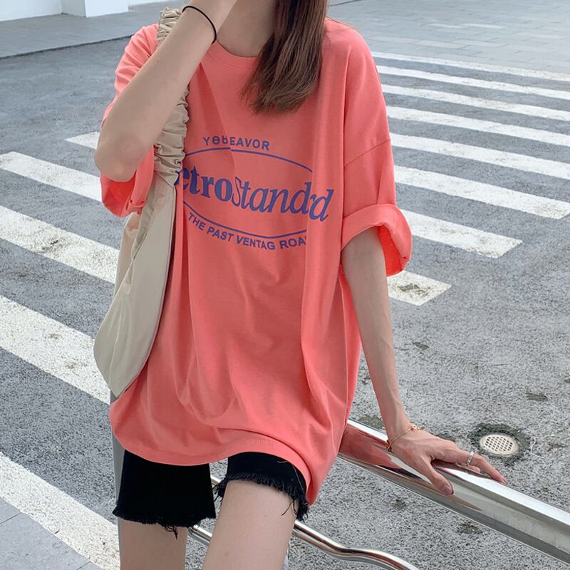 プリント柄ラウンドネックTシャツ サマーレッドルーズトップス 夏物 Oネック スーパーモール4295557791