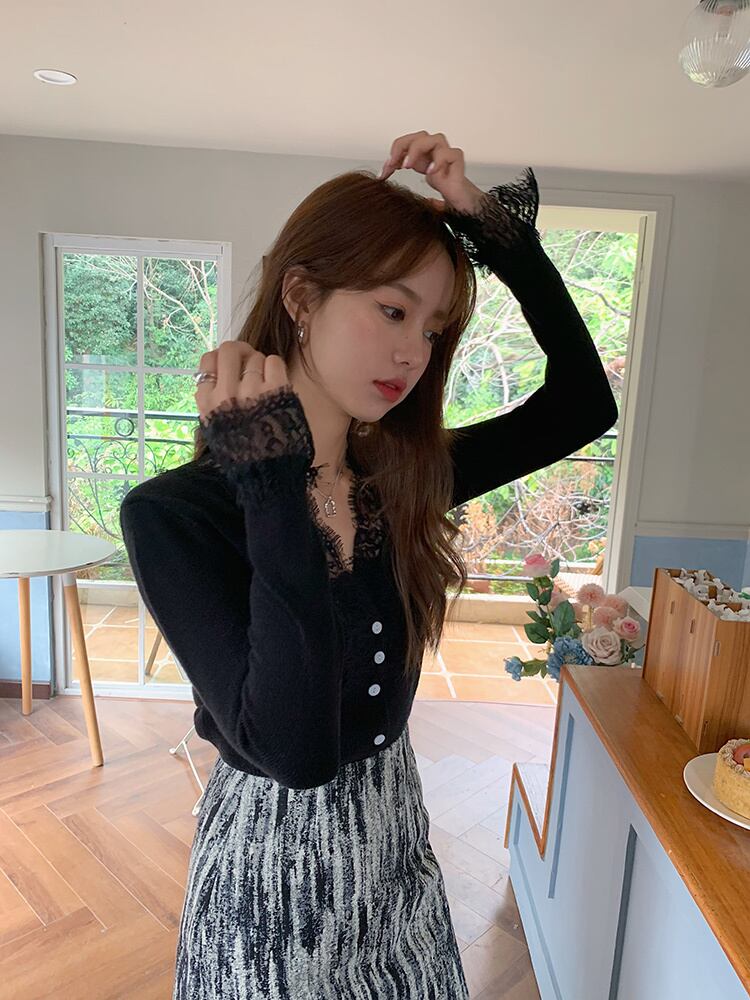 Vネックレースブラウス スプリングスタイルショートセーター レディース 春物 スーパーモール40913343767