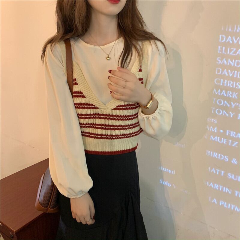 スプリングオータムノースリーブストライプニットレッドルーズショートトップス 春物 秋物 スーパーモール98227009780