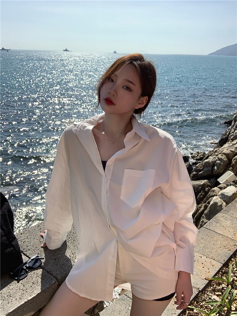 スプリングルーズ薄手シャツ レッドソリッド カラー ロング 春物 ソリッドカラー スーパーモール76527774312