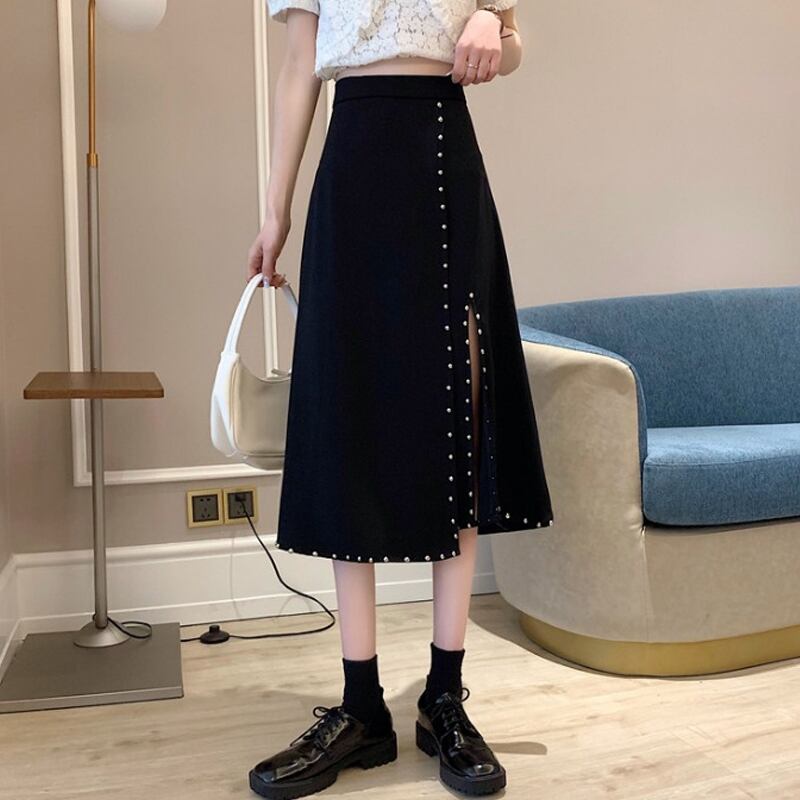 スプリングオータムハイウェストAラインスカート ブラックロング 春物 秋物 スーパーモール13969214944
