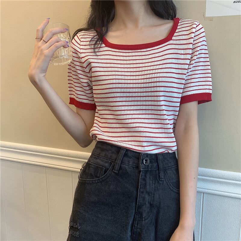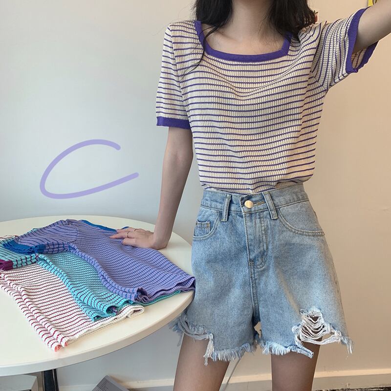 カラーストライプセーター レディースサマールーズトップス 夏物 スクウェア ステッチ スーパーモール88835820577