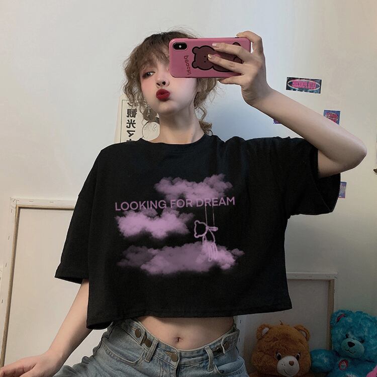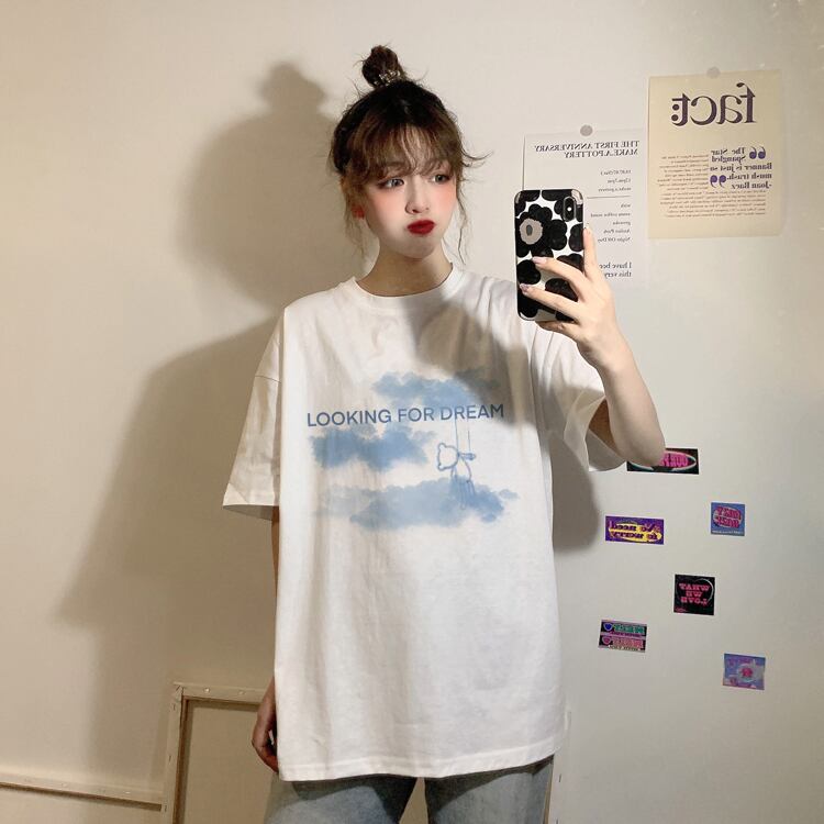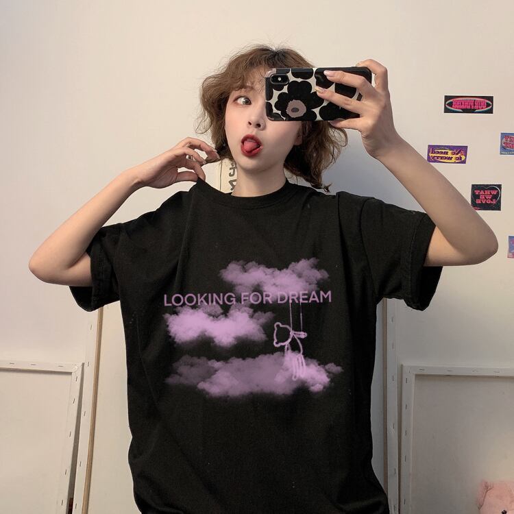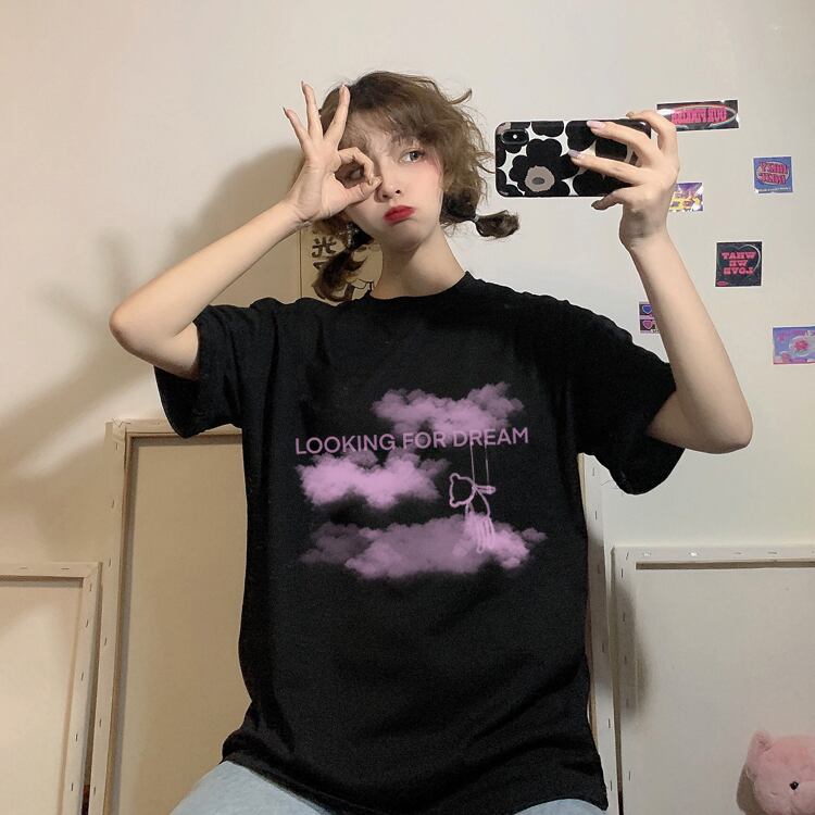 ルーズブラックTシャツ シャツ スプリングプリントトップス 春物 スーパーモール3849921548