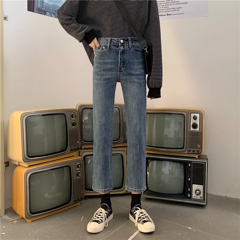 スプリングスタンダードパンツ ブルーハイウェストジーンズ 薄手 レトロ 春物 スーパーモール51572008439