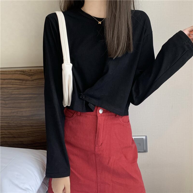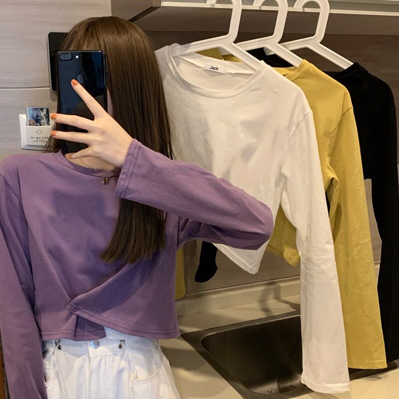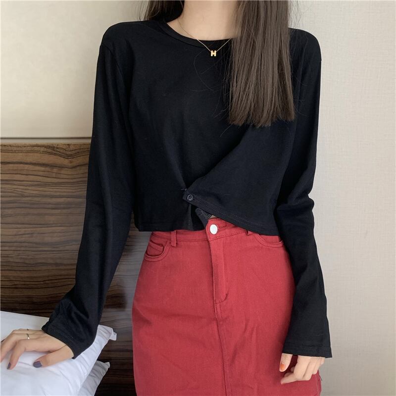 スプリングスタイルダークボタンTシャツ レディースルーズショートトップス ロング 春物 スーパーモール8336258735
