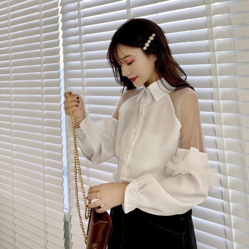 スプリングホワイトシャツ メッシュスリーブ 大人ガーリー スウィート キュート カジュアル 春物 ステッチ スーパーモール55076328457