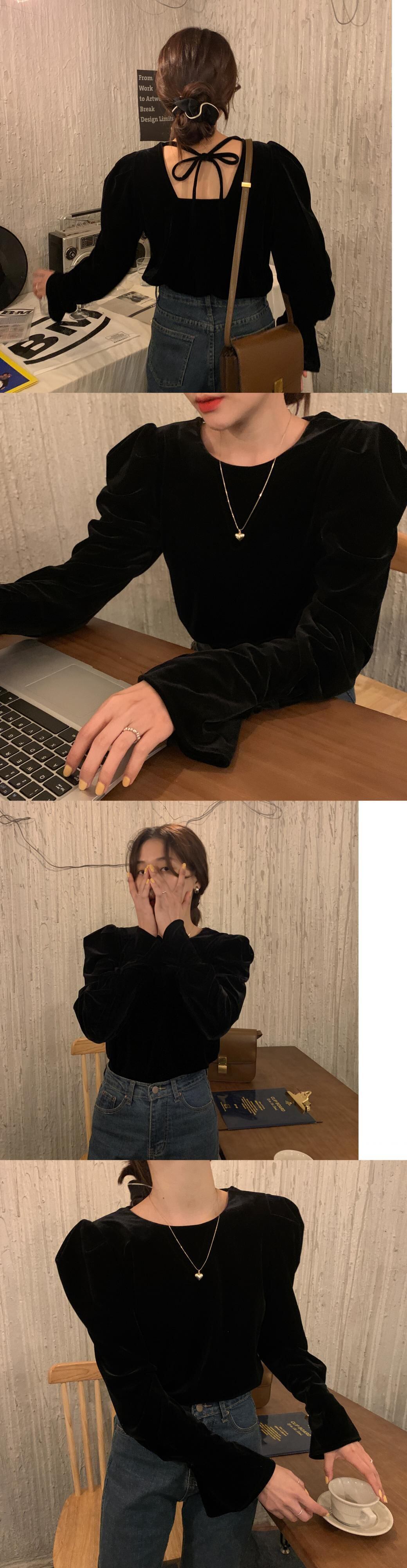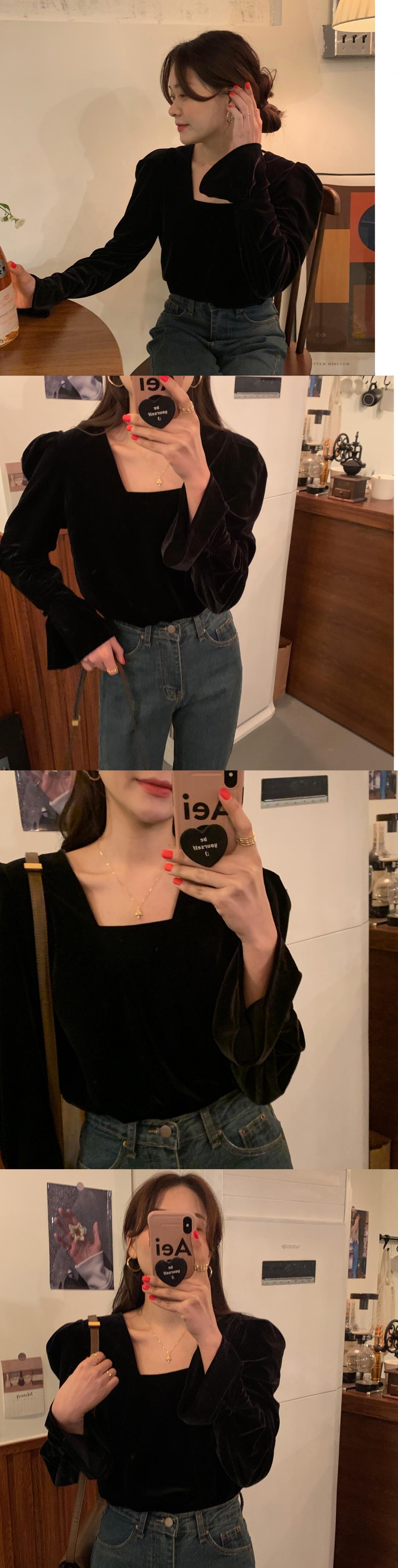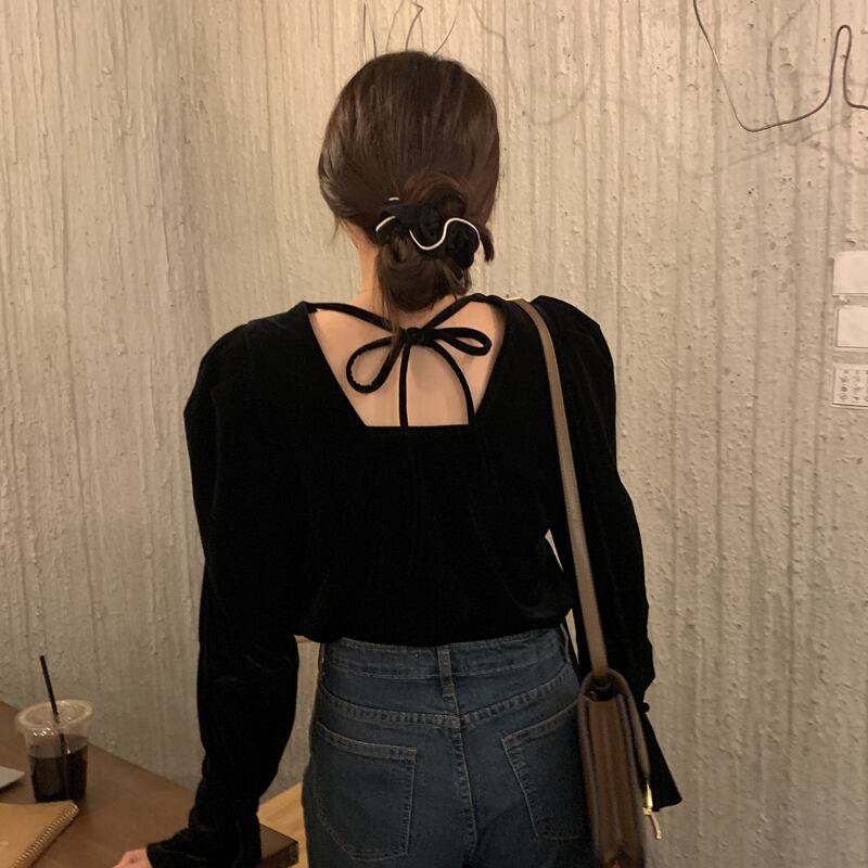 スプリングブラックカラーブラウス レディーススタイルスタンダードベルベットスリーブシャツ レトロ 春物 スクウェア スーパーモール81169577828