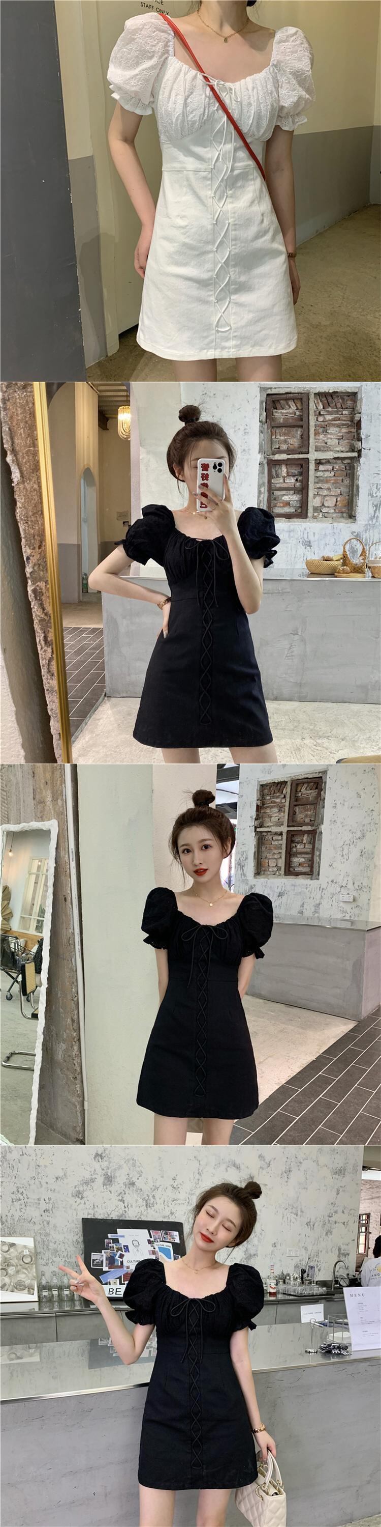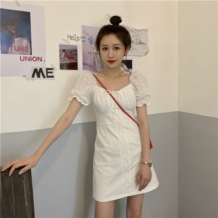 スタンダードスリーブドレス スプリングオータムホワイトスカート レトロ 春物 秋物 スクウェア スーパーモール6108976636