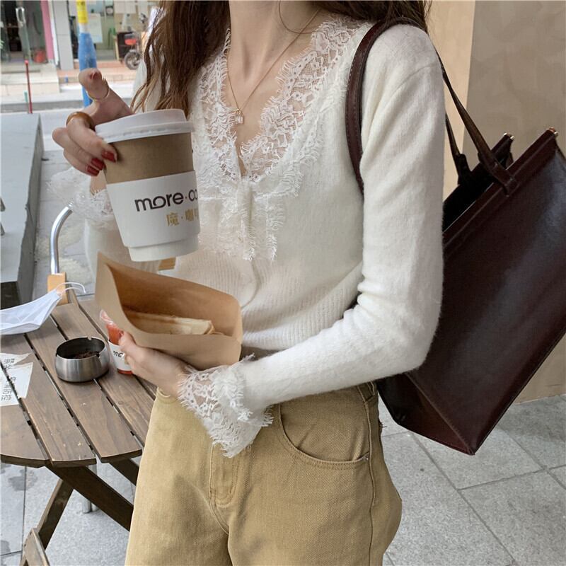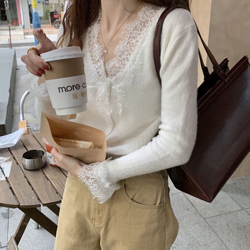 スプリングスタイルホワイトVネックレースシャツ ショートニットセーター レディース 春物 スーパーモール55625217738