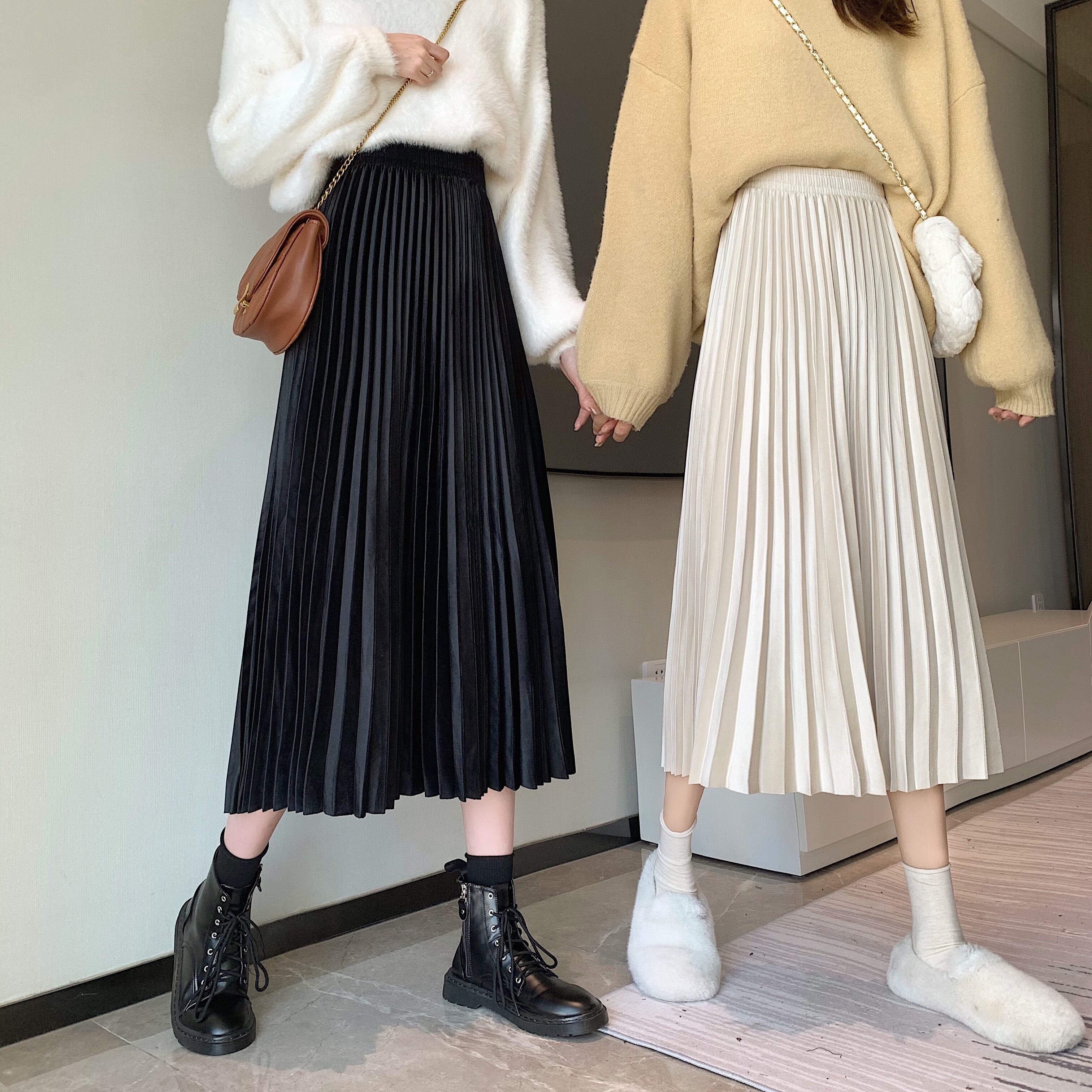 スプリングオータムベルベットスカート ハイウェストウェストブラックプリーツ薄手Aライン 春物 秋物 スーパーモール94969181947