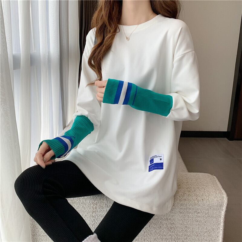 スプリングホワイトシャツ トップス ルーズストライプTシャツ レディース ロング 春物 ステッチ スーパーモール15818654616
