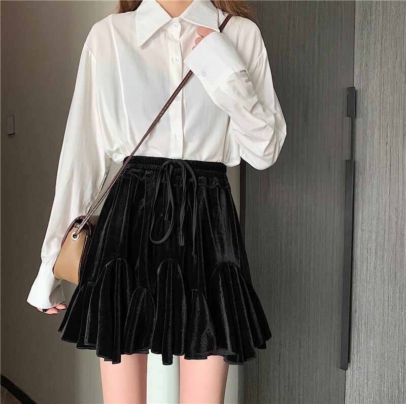ゴールドベルベットスカート スプリングオータムプリーツ薄手Aラインブラックショート 春物 秋物 スーパーモール1502431079