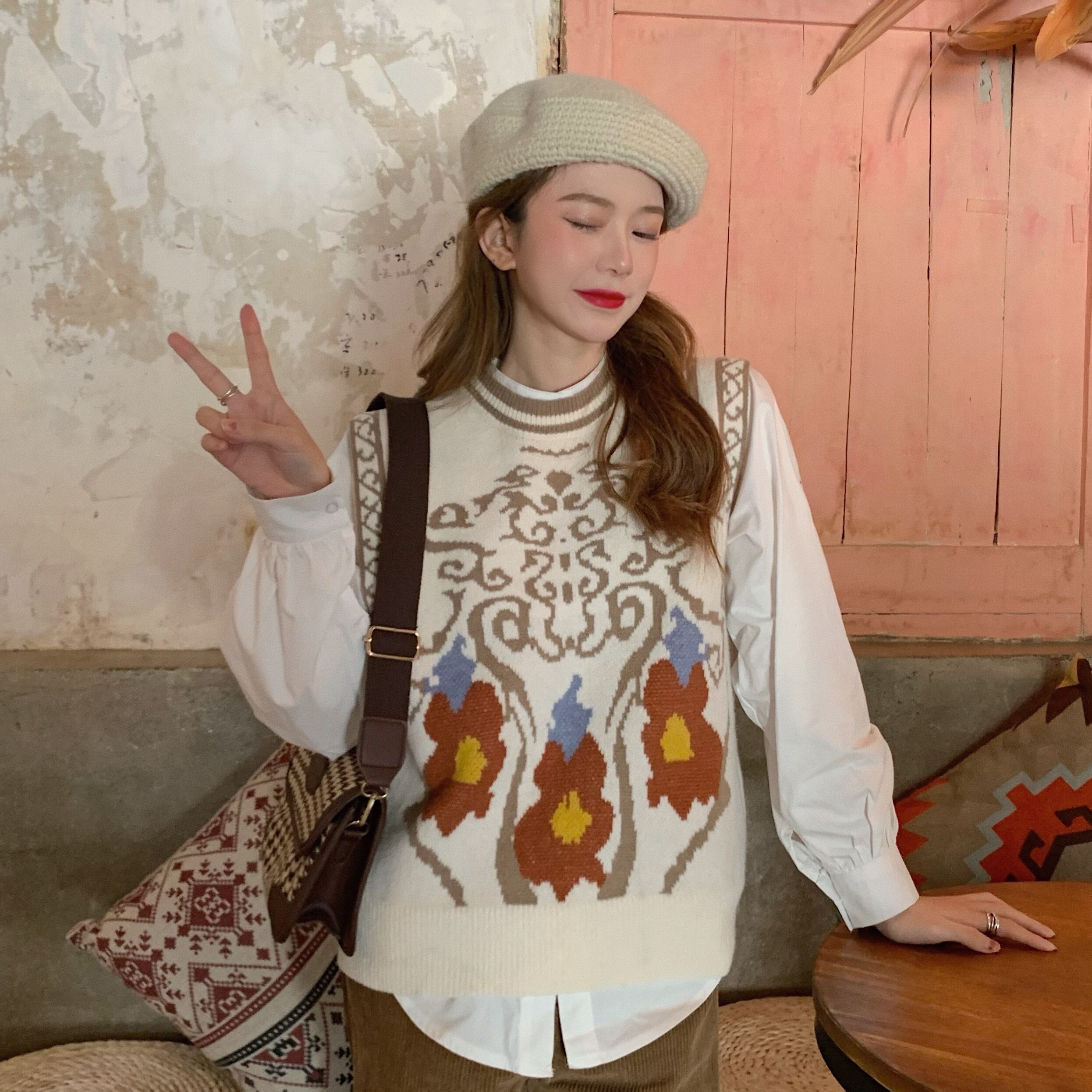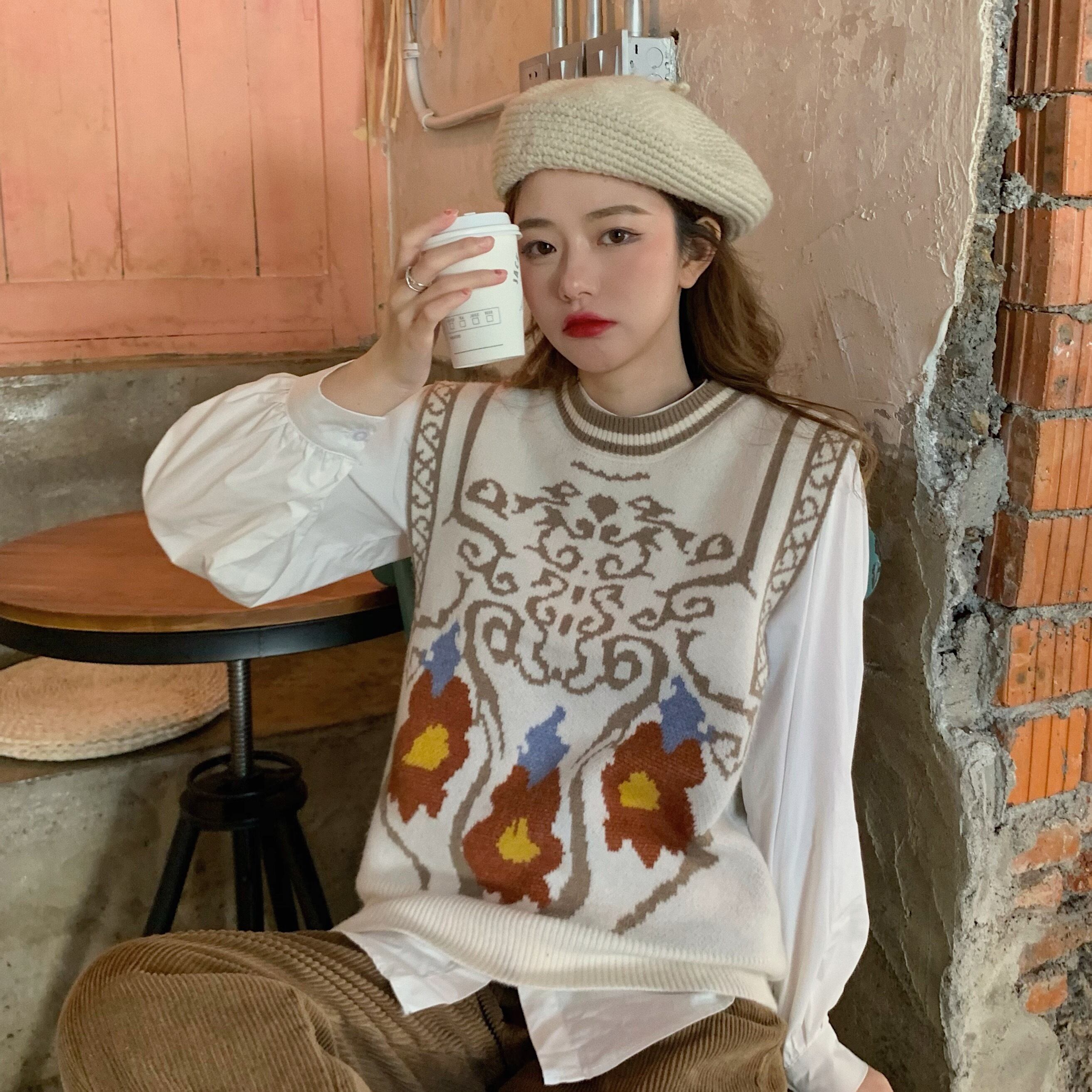 スタンダードノースリーブニットレディーススプリングオータムルーズジャカード レトロ 春物 秋物 スーパーモール95163562537