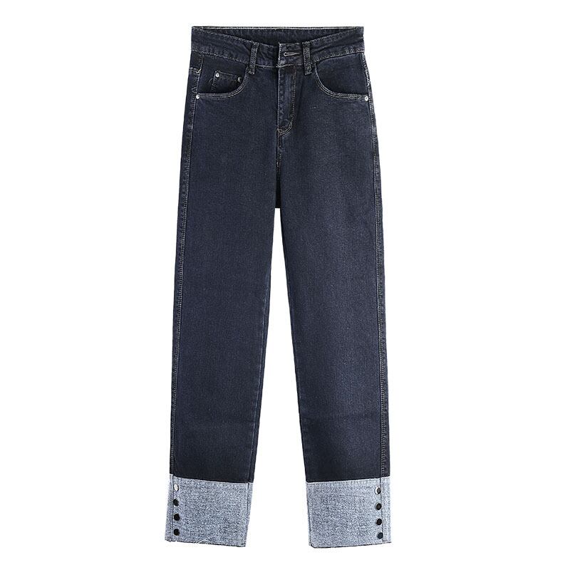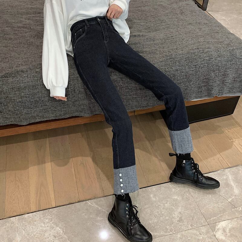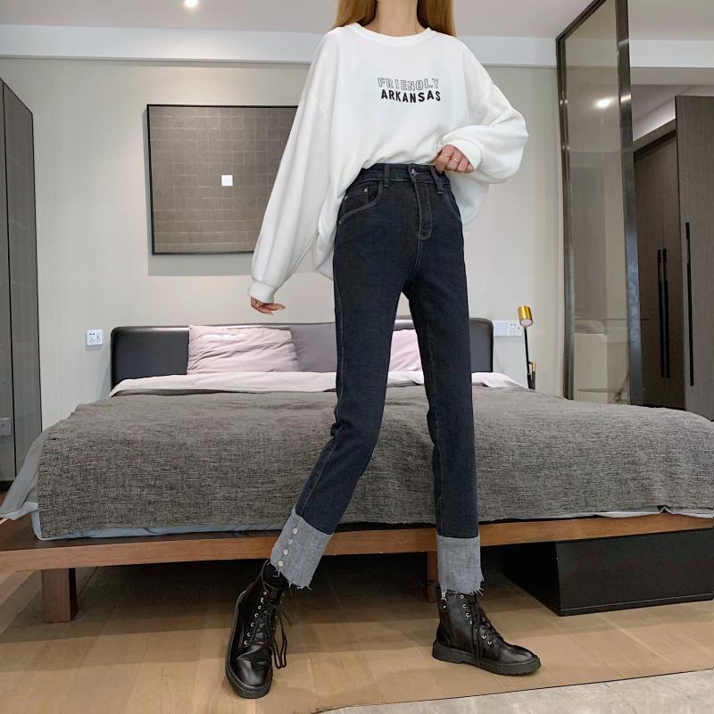 スプリングオータムブラックパンツ ルーズハイウェストウェストジーンズ ベルベット 春物 秋物 ステッチ スーパーモール57942432077