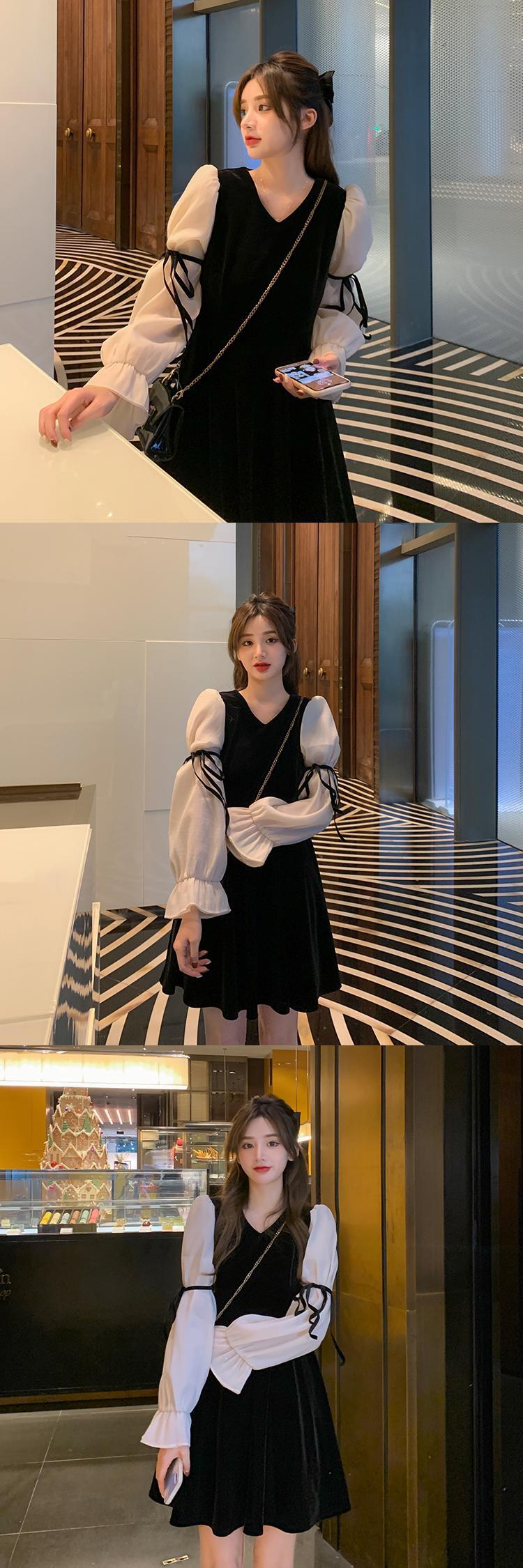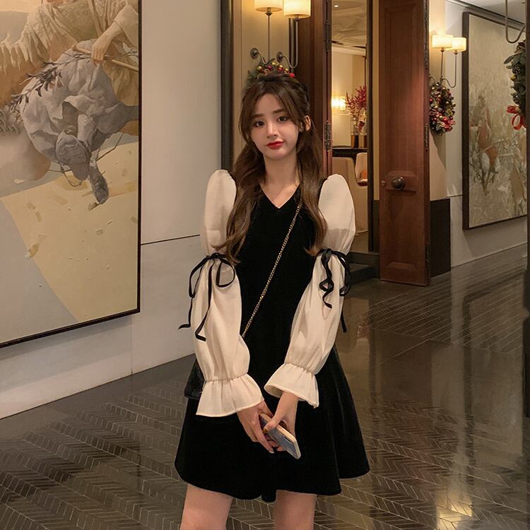 スプリングスタンダードスリーブドレス ブラックスカート レトロ 春物 スーパーモール20717627169