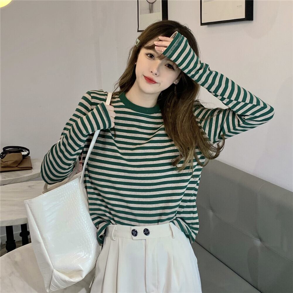スプリングストライプセーター ルーズ薄手シャツ グリーントップス ロング 春物 スーパーモール36004769148