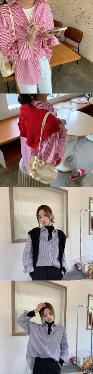 ルーズストライプシャツ スプリングスタンダード ロング レトロ 春物 スーパーモール79127664129