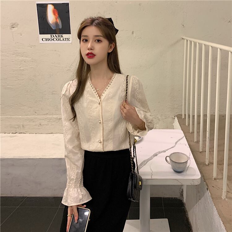 シャツ レディーススプリングスタイルVネックレースジャカード ロング 春物 スーパーモール5575903482