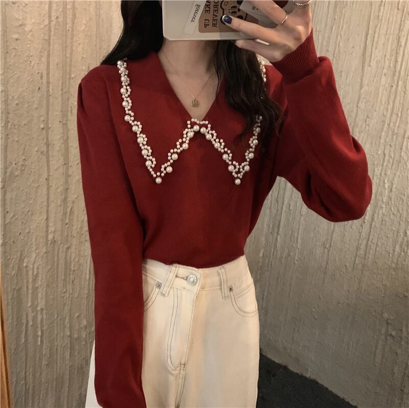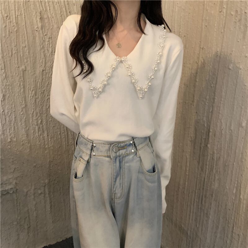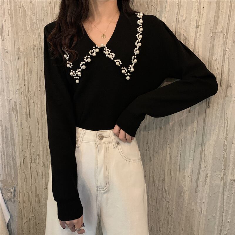 スプリングパールルーズVネックスタイルカラーブラックシャツ セーター レディース 春物 真珠 スーパーモール51000119862