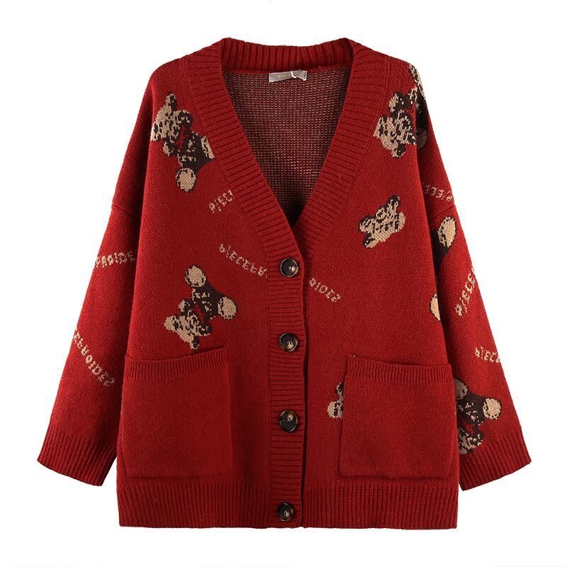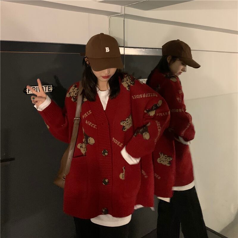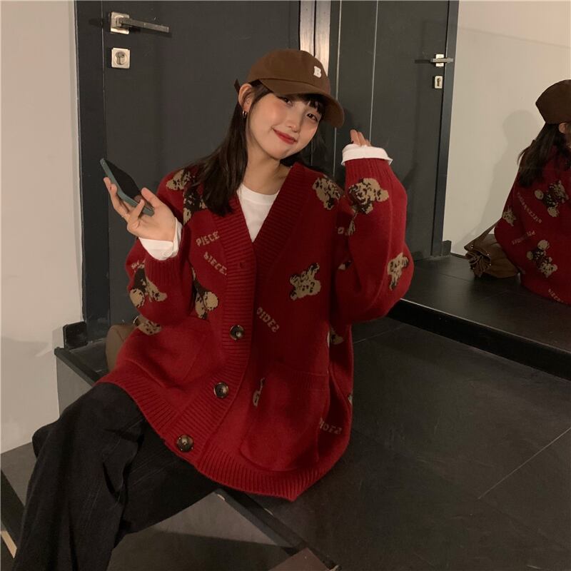 スプリングオータムルーズニットカーディガンレッドセーター ジャケット レディース 春物 秋物 スーパーモール83420879950