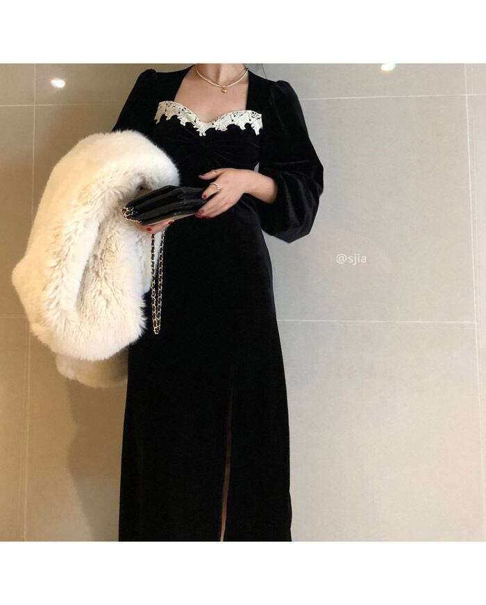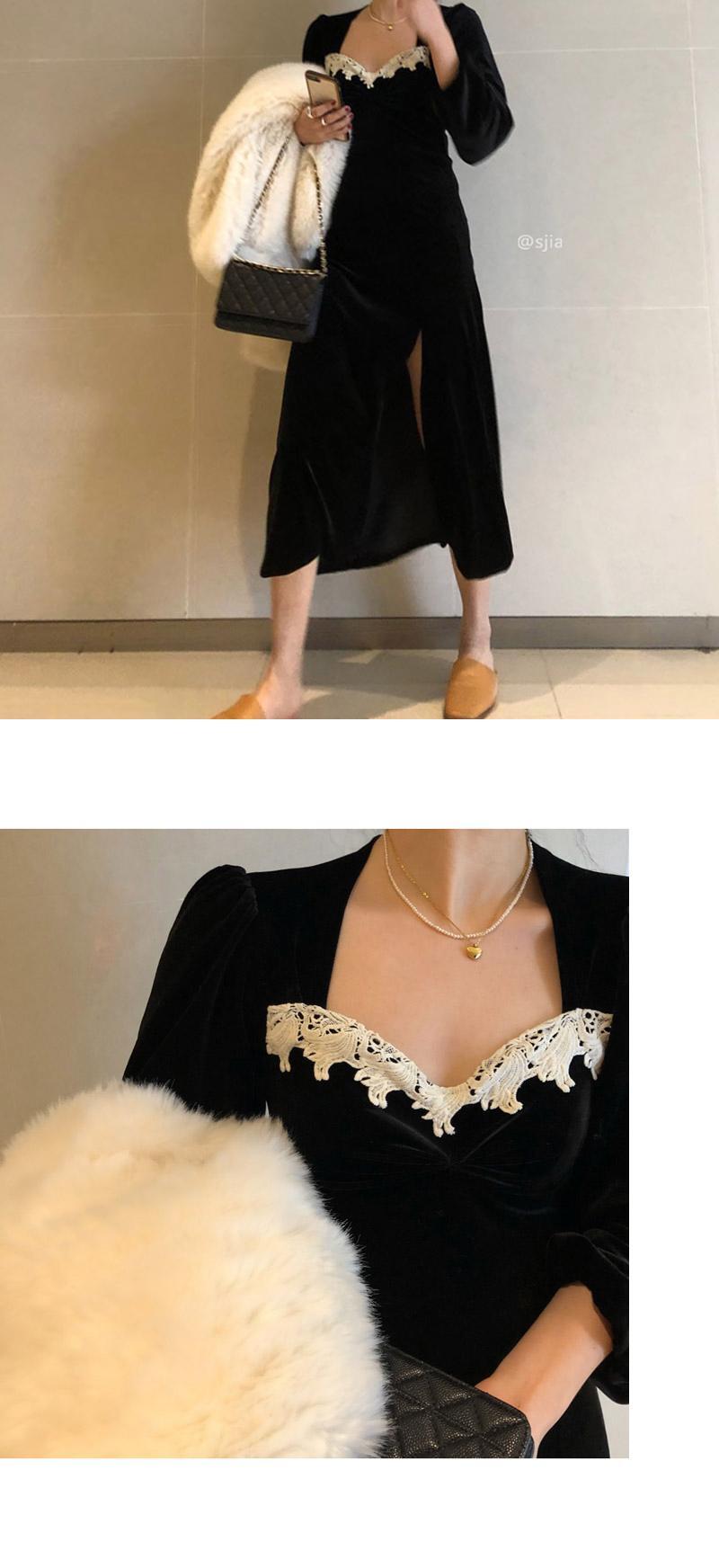 スタイルVネックベルベットドレス レディーススプリングスタンダードロングブラック レトロ レース 春物 スーパーモール11105924137