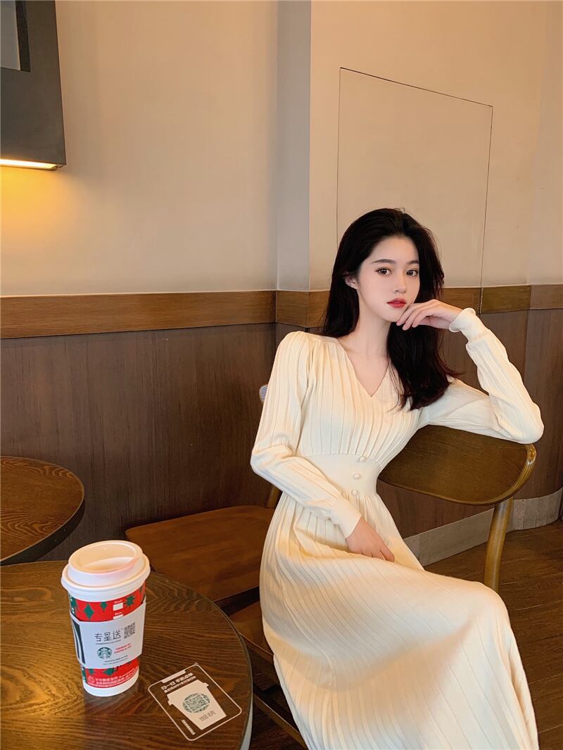 スプリングニットドレス スタイルVネックウェストスカート 春物 スーパーモール18157751489