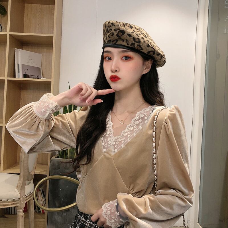 スタンダードベルベットブラウス スプリングVネックレースシャツ レディース ロング レトロ 春物 ステッチ スーパーモール82168975558