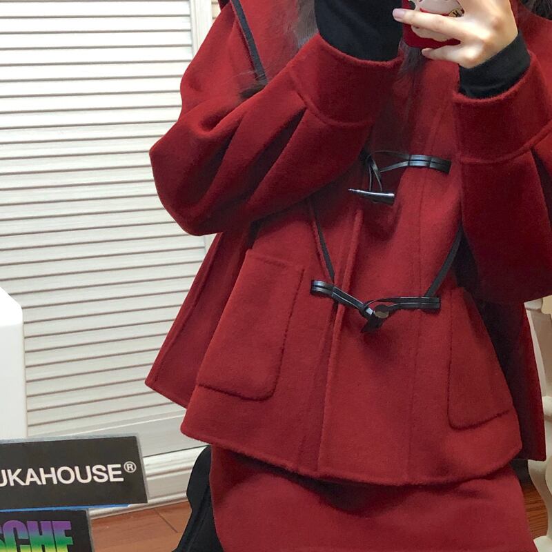 スプリングスタンダードレッドボタンコート ハイウェストウェストスカート レトロ 春物 スーパーモール30319892719