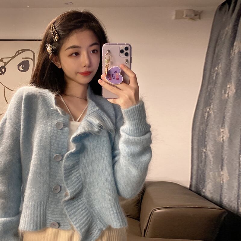 ニットカーディガンジャケット スプリングオータムVネックルーズショートブルーセーター 春物 秋物 スーパーモール92418906355