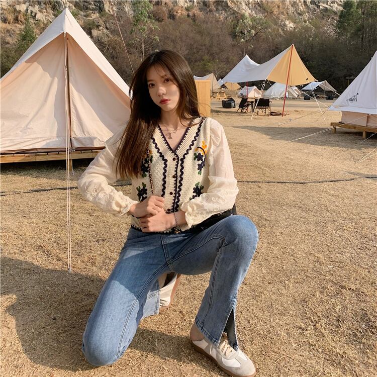 Vネックセーター レディーススプリングスタイルショートトップス オータムカーディガンジャケット ロング レッド 刺繍 春物 秋物 スーパーモール70748709348