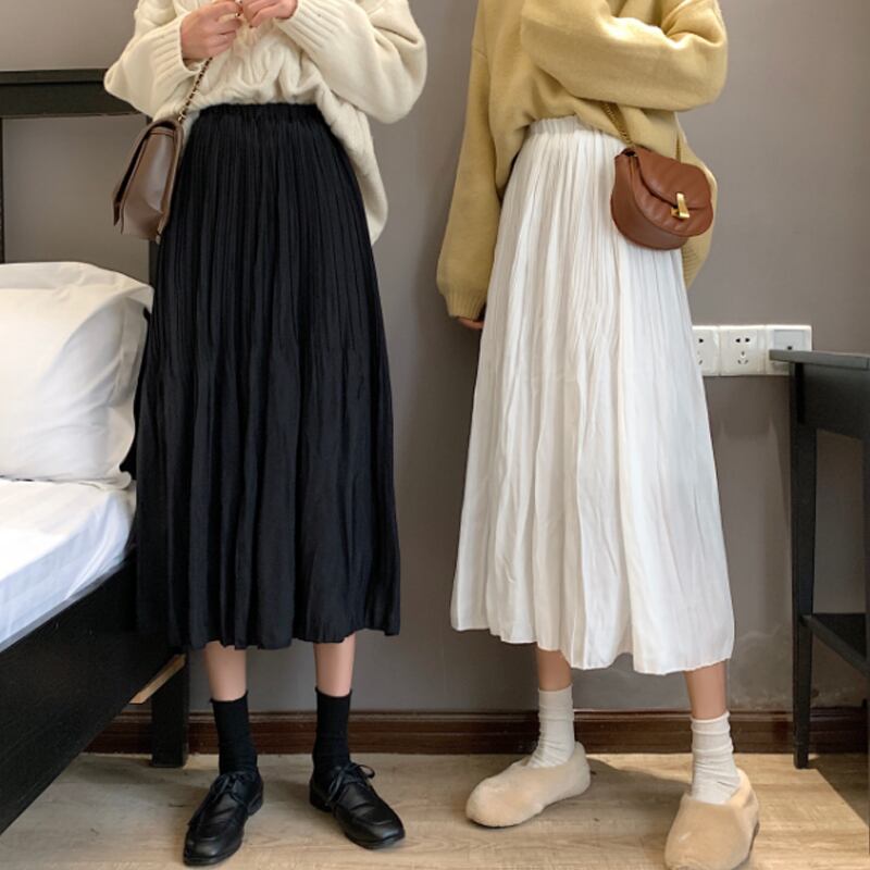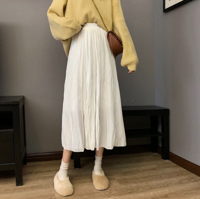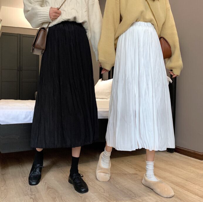 スプリングオータムブラックプリーツスカート 薄手ハイウェストAライン 春物 秋物 スーパーモール31908009284