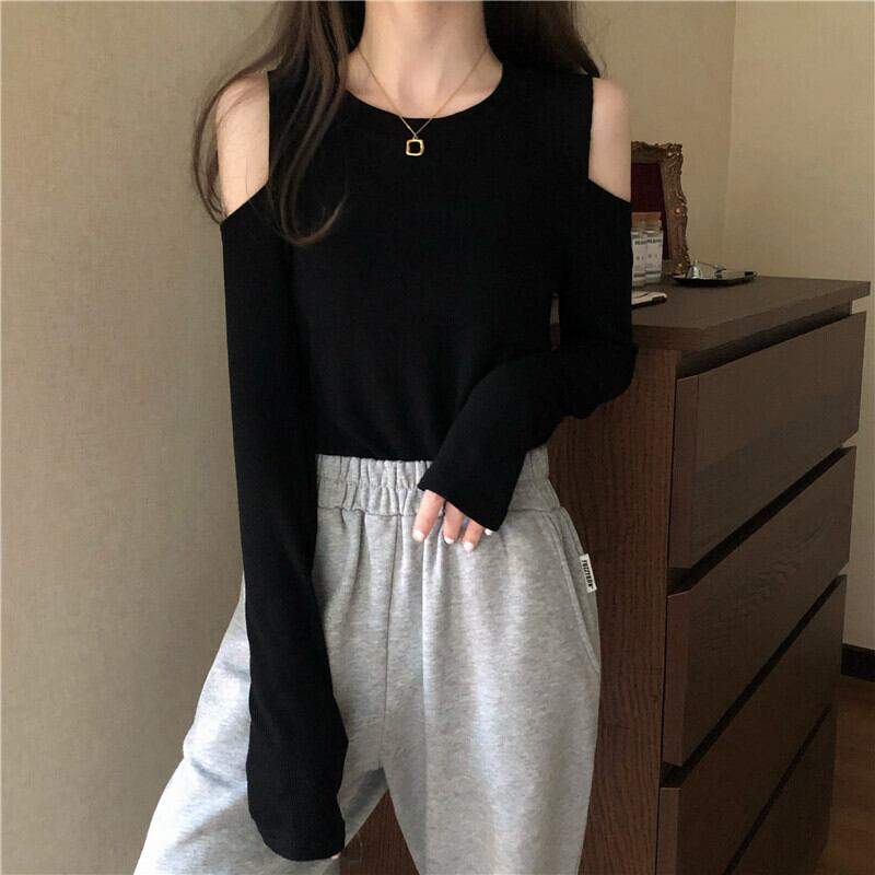 スプリングブラックTシャツ シャツ スリムスタイルトップス レディース ロング 春物 オフショルダー スーパーモール2045489840