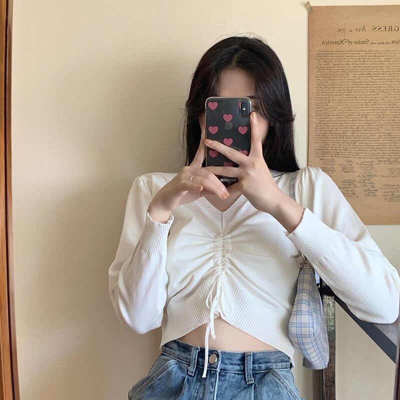 ギャザーセーター スプリングスタイルVネックショートクロップトップ トップス ロング 春物 スーパーモール48555220702