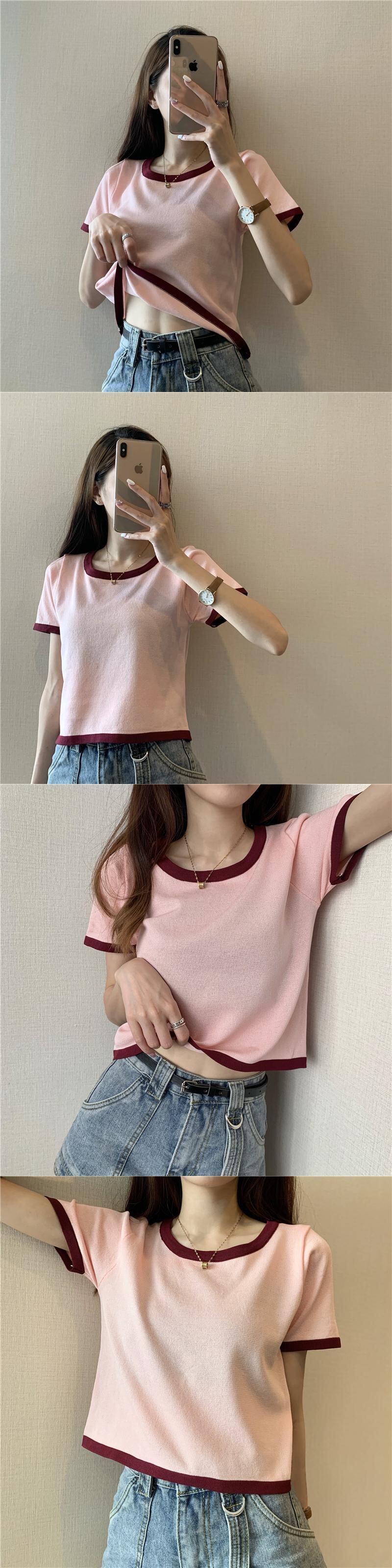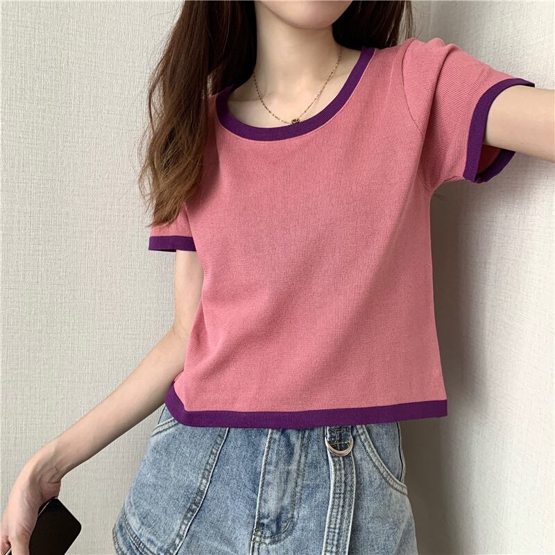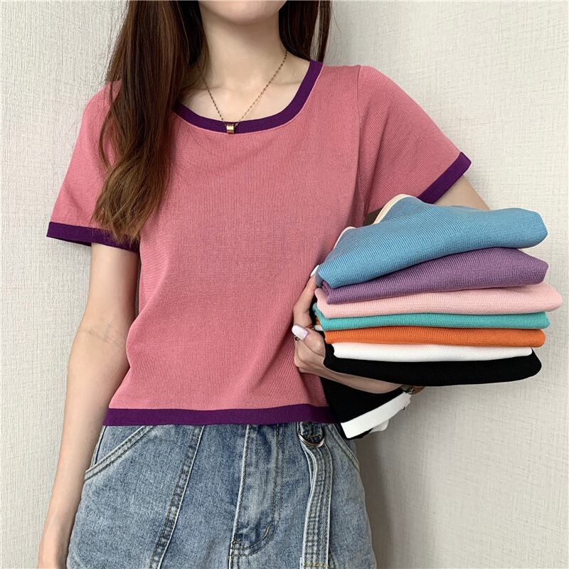 ニットセーター スプリングスリム薄手ブラックショートTシャツ サマートップス レディース 春物 夏物 シルク スーパーモール32627465664
