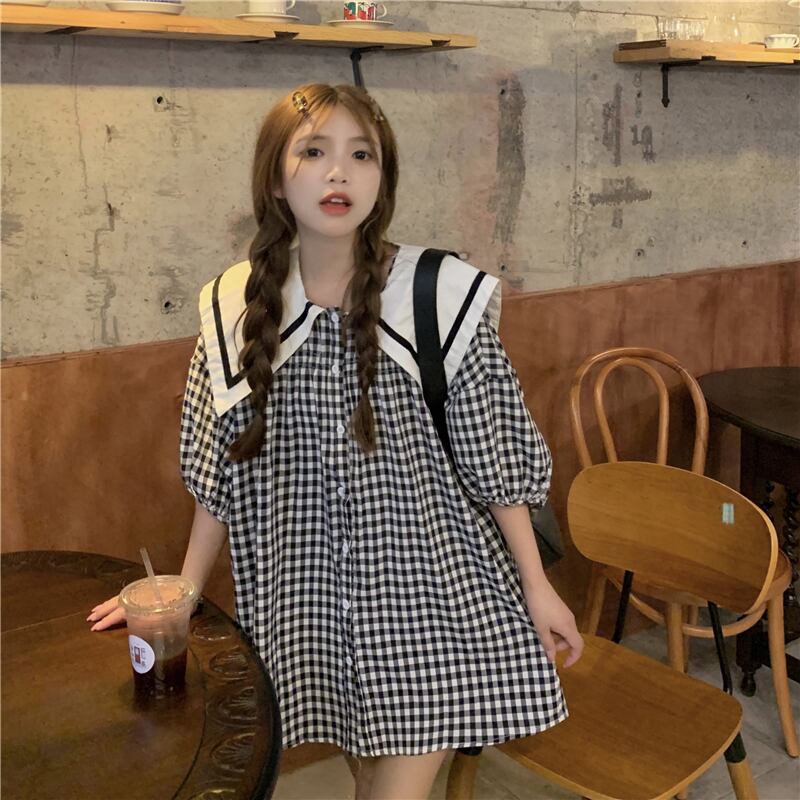 ネイビーカラー格子柄シャツ サマースタイルスリーブトップス 夏物 スーパーモール55413482349