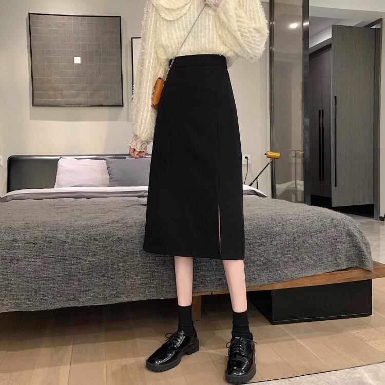 スプリングオータムハイウェストAラインスカート スリットロングブラック 春物 秋物 スーパーモール61546868801