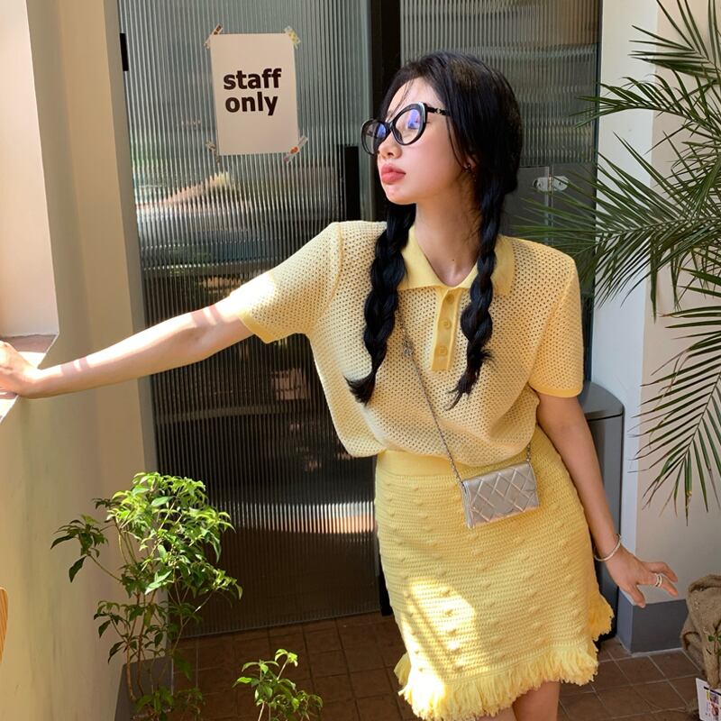 イエローカラー薄手ショートセーター レディースサマートップス 大人ガーリー スウィート キュート カジュアル 夏物 スーパーモール11508162343