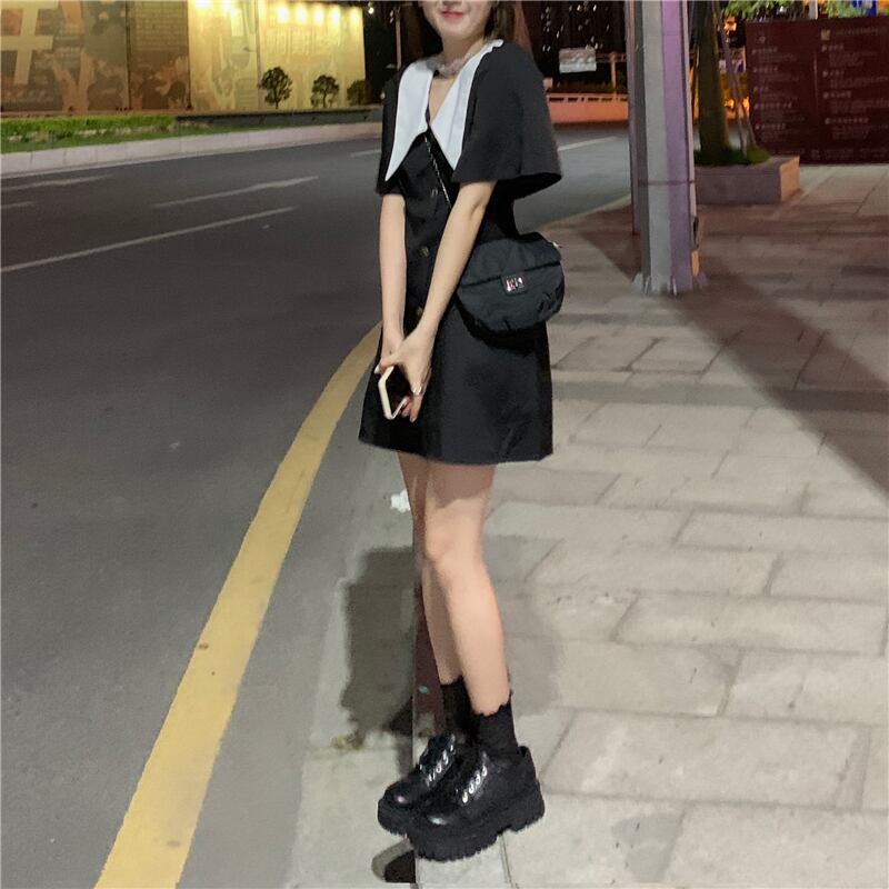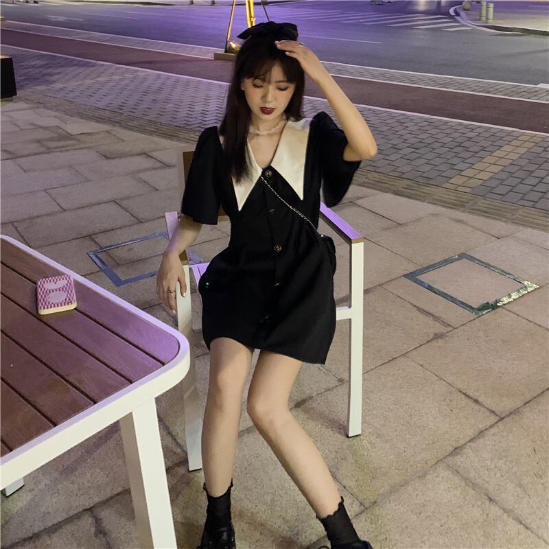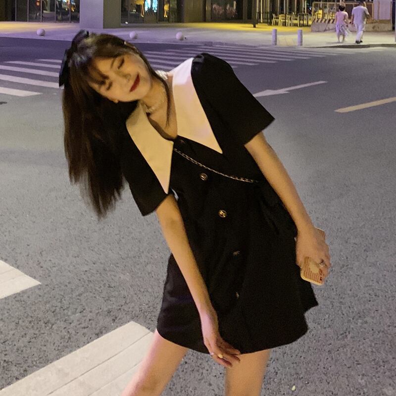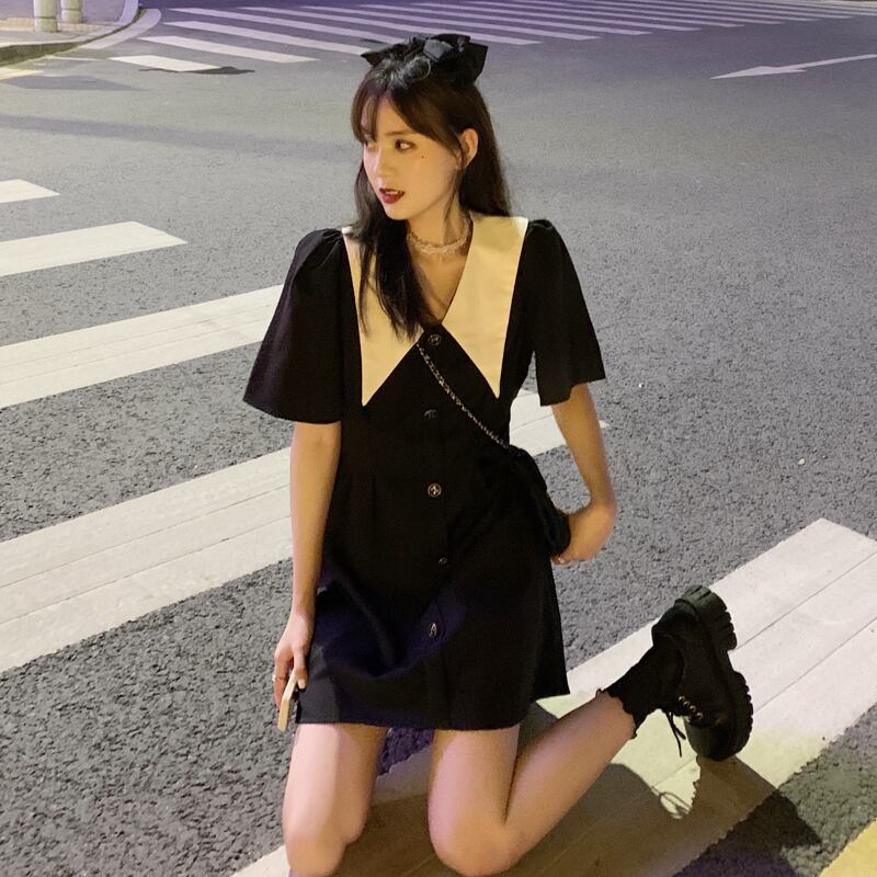 ブラックカラードレス サマースタンダードショートスカート レトロ 夏物 スーパーモール37820206583