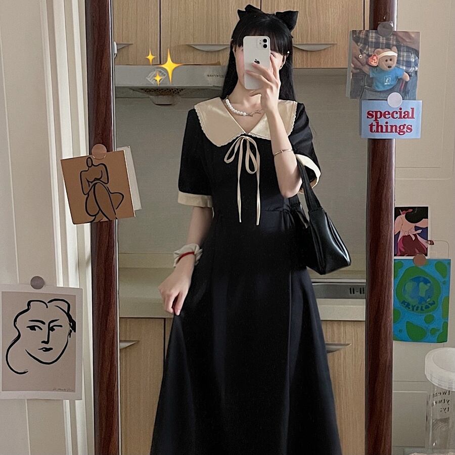 ブラックカラードレス サマースタンダードロングスカート レトロ 夏物 スーパーモール14185032767
