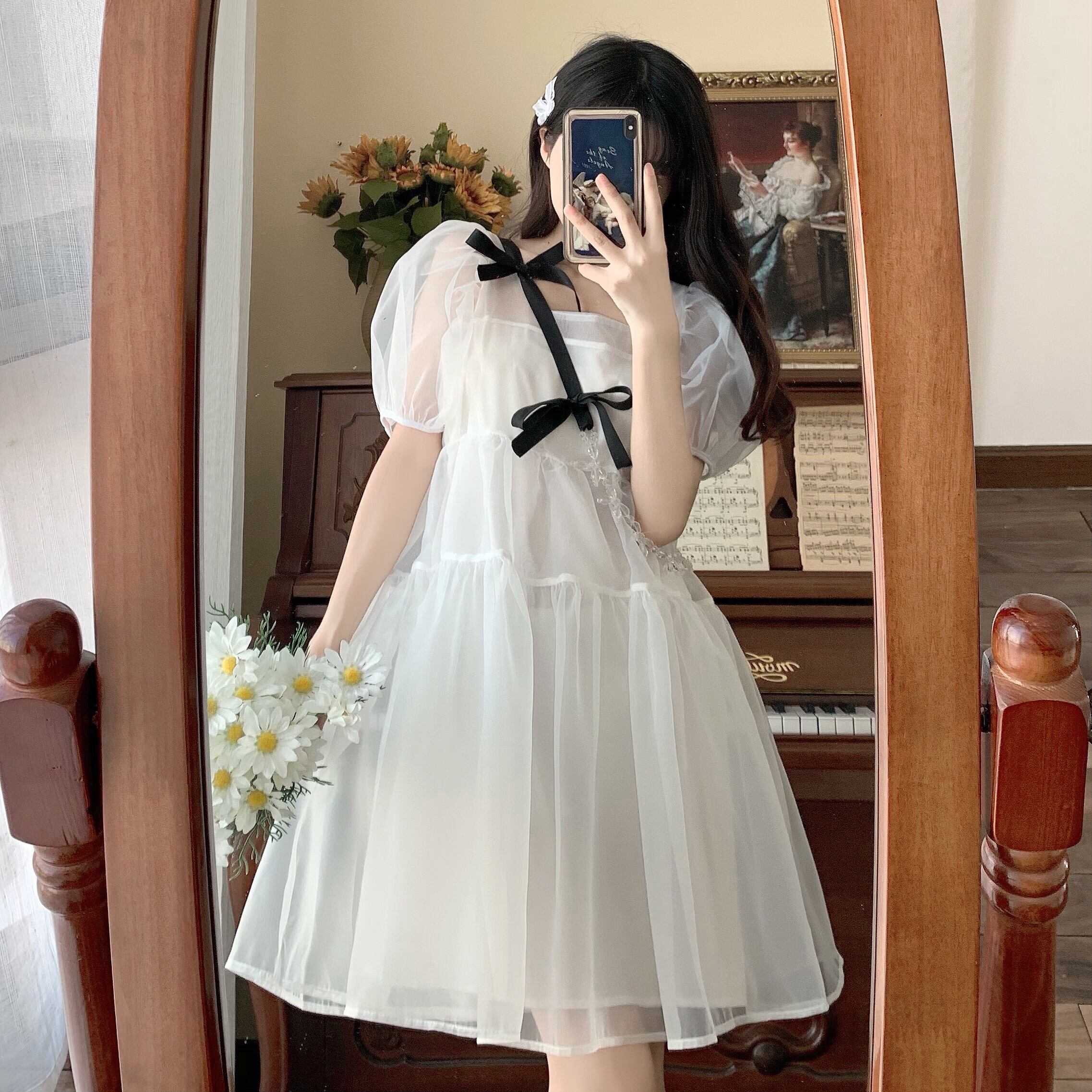 スリーブホワイトドレス サマーショートスカート 大人ガーリー スウィート キュート カジュアル 夏物 スーパーモール9026785874