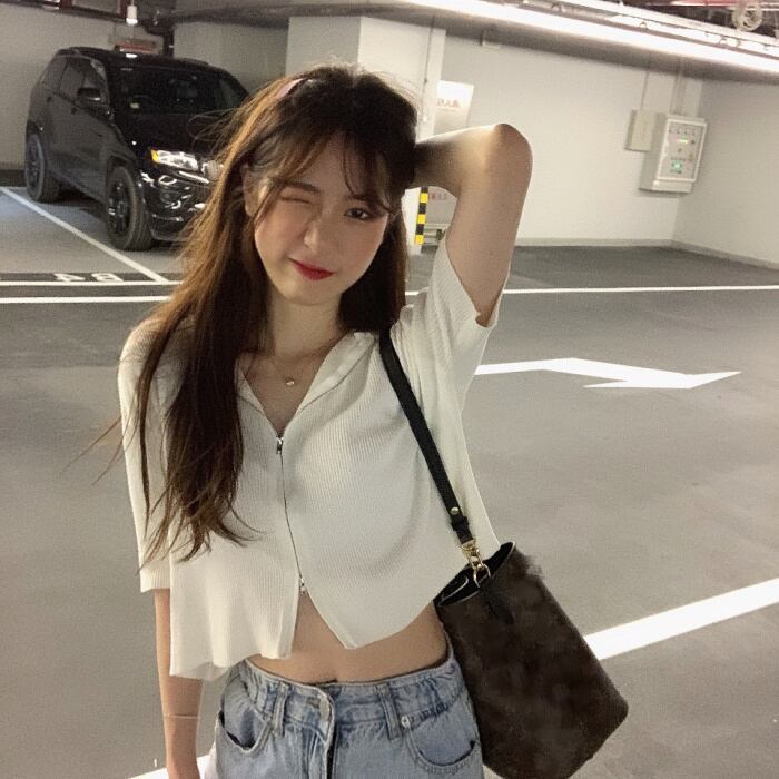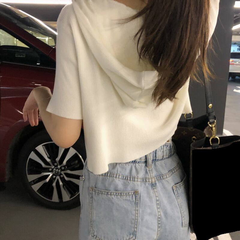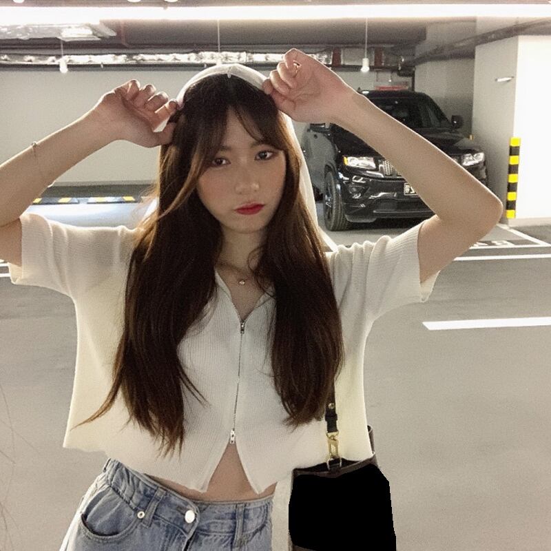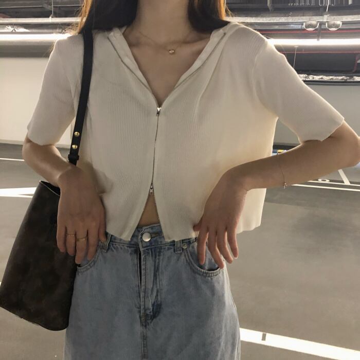 サマーダブルジッパーショートホワイトセーター 薄手フードカーディガントップス 夏物 スーパーモール19942617229