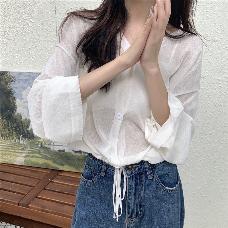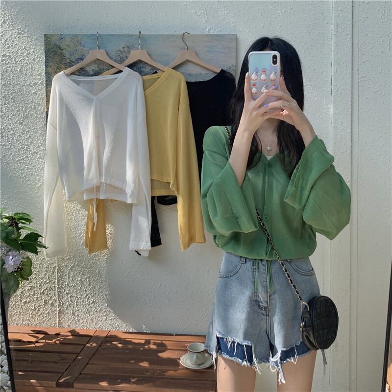 薄手グリーンVネックジャケット レディースサマールーズニットカーディガンショートトップス ロング 夏物 スーパーモール18998933815