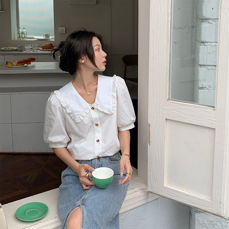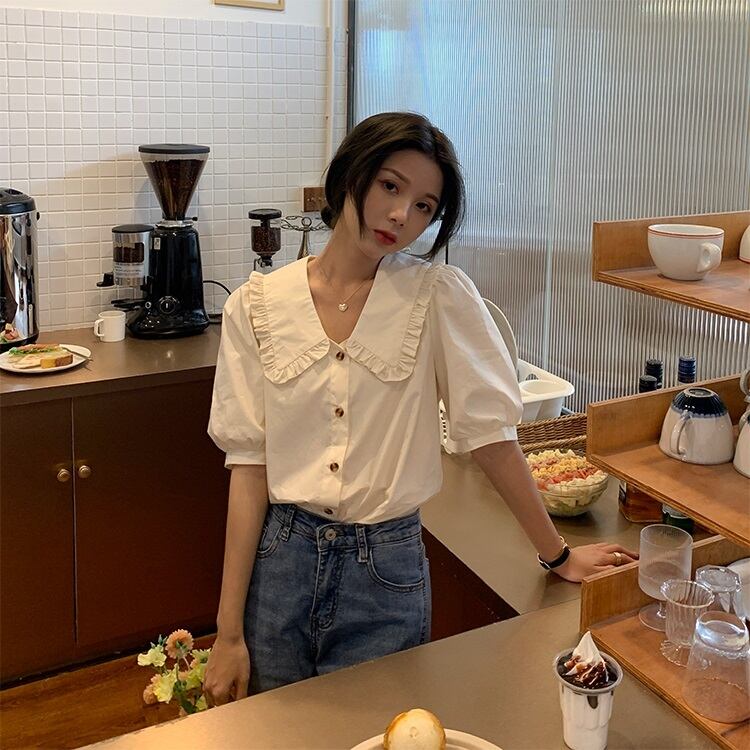 カラーホワイトシャツ サマースリーブトップス 大人ガーリー スウィート キュート カジュアル 夏物 スーパーモール35701104657