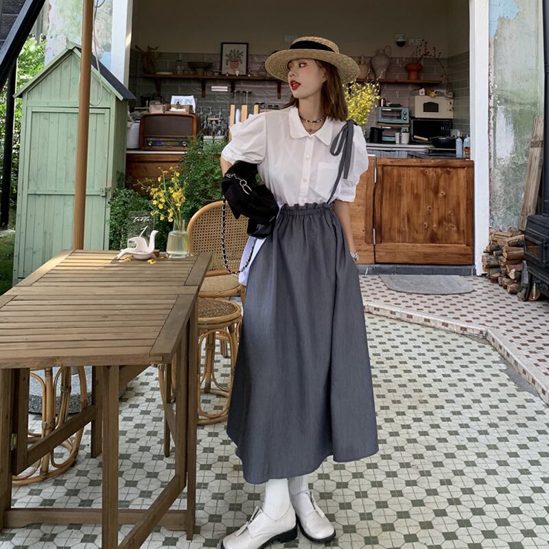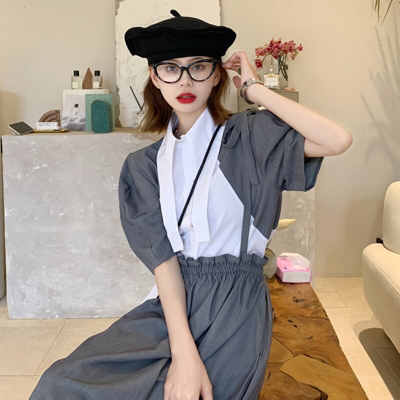 色:グレーのシャツシングル,ダークグレーのサスペンダースカートワンピース