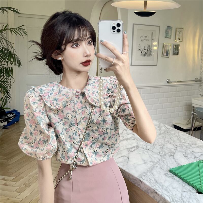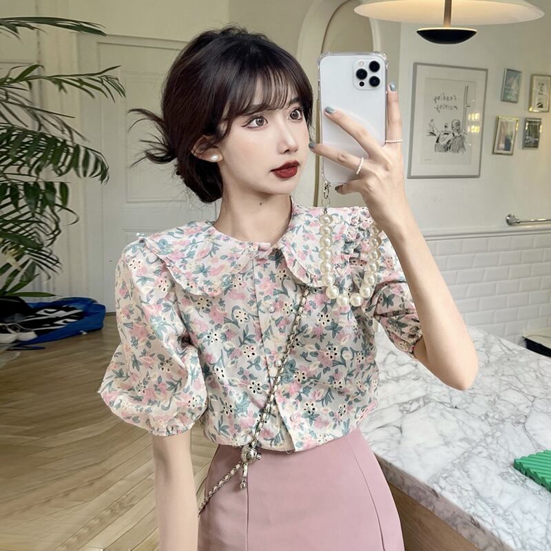 カラースリーブフローラルシャツ サマートップス 大人ガーリー スウィート キュート カジュアル 夏物 花柄 スーパーモール64989792624