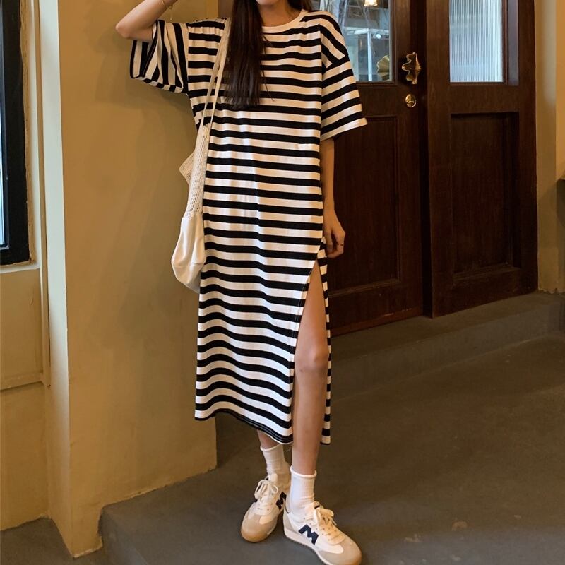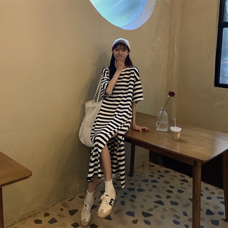 ストライプカジュアルTシャツ ドレス サマールーズロングスカート 夏物 スーパーモール31003266677