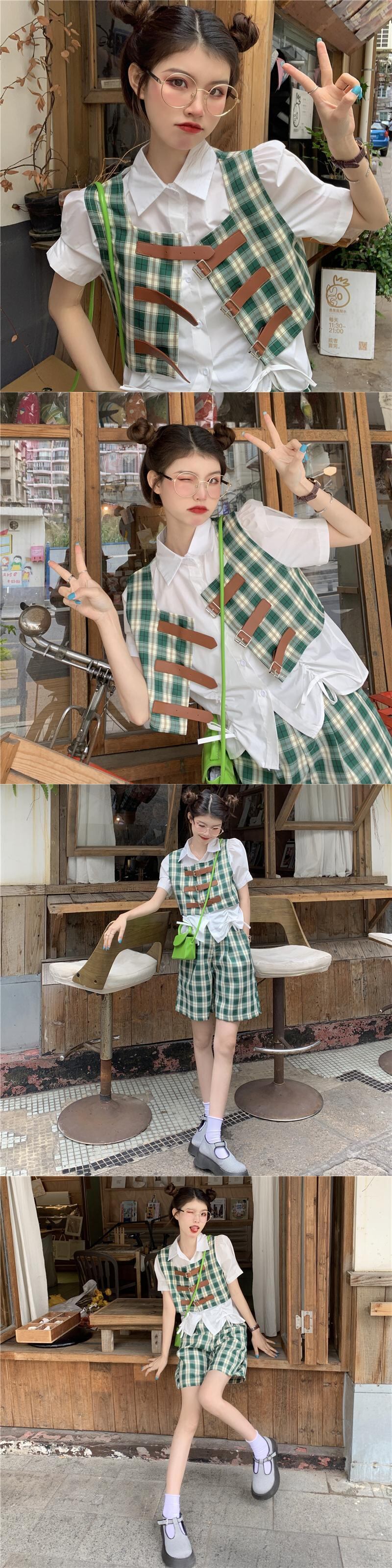 色:白いシャツのワンピース,グリーングリッドベスト+ショーツ,ブラックグリッドベスト+ショーツ
