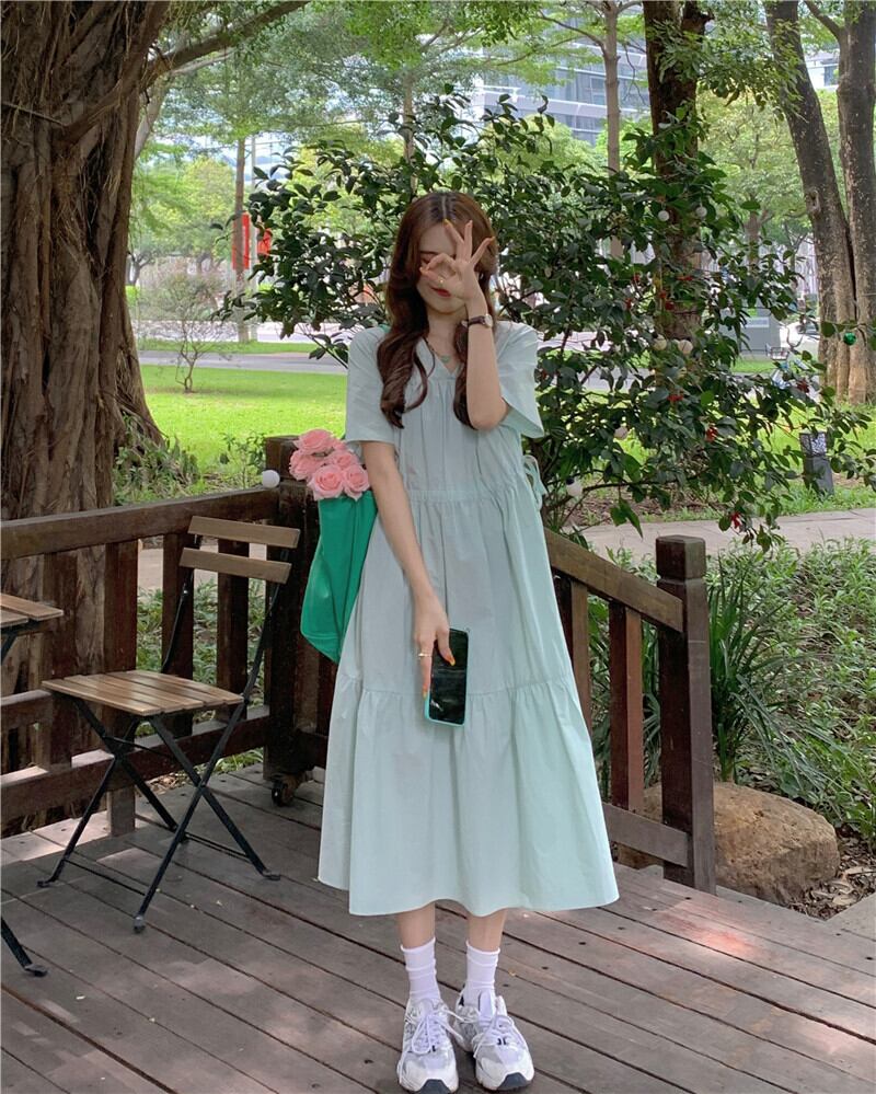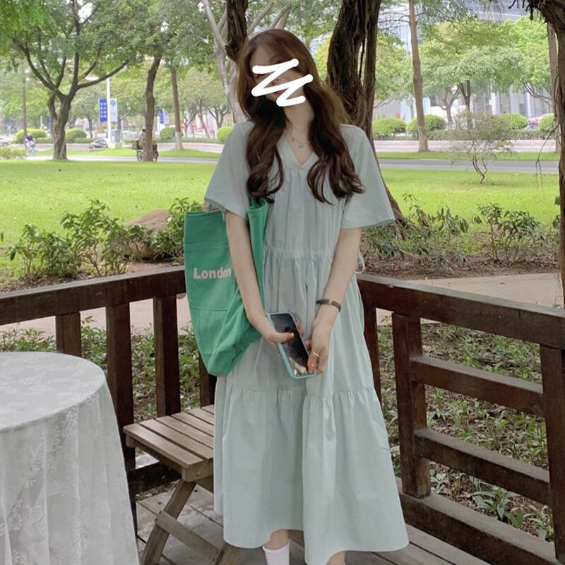 グリーンVネックドレス サマースタイルロングスカート 夏物 スーパーモール54422303854