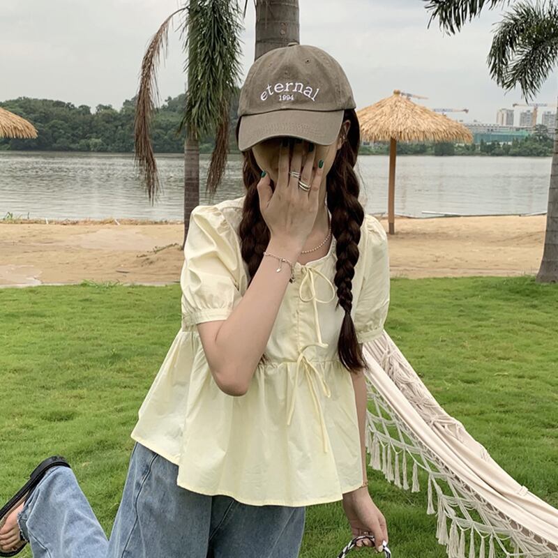 スリーブシャツ レディースサマーイエローショートトップス レース 夏物 レースアップ スーパーモール41728965692
